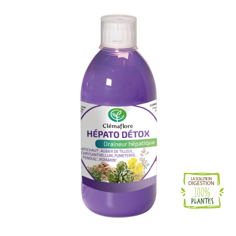 Hépato détox de la marque Clémaflore est un complexe de 7 extraits de plante : l'Artichaut, l'Aubier de Tilleul, le Chrysanthellum, le Fumeterre, le Fenouil, le Pissenlit et le Romarin. Ce draineur a un goût menthe. Le foie a de nombreuses fonctions. Son rôle principal est de filtrer, stocker et épurer l'organisme. Il sécrète de la bile afin d'aider à digérer les graisses. L'Artichaut a un effet détoxifiant et favorise le bon fonctionnement du foie. Le Fenouil favorise les fonctions d'élimination rénales. Le Romarin soutient la fonction hépatique et biliaire.